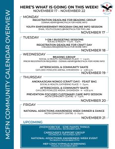 What’s Happening This Week at MCFN Here’s what’s happening around the community this week — mark your calendars! Monday, November 17th Registration Deadline for Beading
