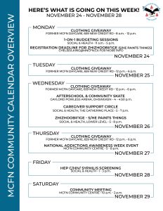 What’s Happening This Week at MCFN Here’s what’s happening around the community this week — mark your calendars! Monday, November 24th Clothing Giveaway 1-on-1 Budgeting