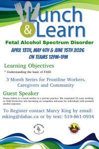 Running April 13th, May 4th, and June 15th on Microsoft Teams 12 – 1 p.m. To register, please contact Marcy King mking@dahac.ca or text 519-861-0394