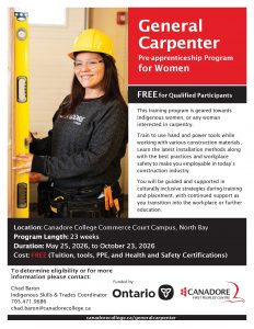 For more information, click here To determine eligibility or for more information, please contact: Chad Baron Indigenous Skills & Trades Coordinator 705.471.9686 chad.baron@canadorecollege.ca