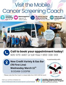 Stop by New Credit Variety & Gas Bar (78 First Line) on Wednesday, March 11th between 9 a.m. and 3 p.m. for free, confidential cancer