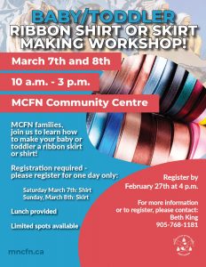 MCFN families are invited to join us on March 7th or 8th to learn how to make a beautiful ribbon shirt or skirt for your