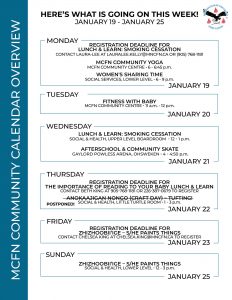 What’s Happening This Week at MCFN Here’s what’s happening around the community this week — mark your calendars! Monday, January 19th Registration Deadline for Smoking
