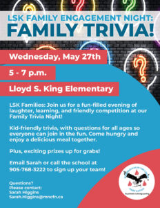 🗓 Wednesday, May 27th ⏰ 5–7 p.m. 📍 Lloyd S. King Elementary 📩 Email Sarah at sarah.higgins@mncfn.ca or call the school at 905-768-3222 to sign