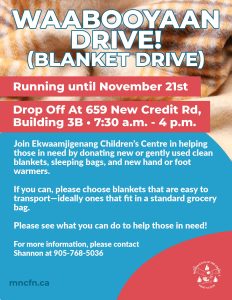 Help us spread warmth this season! Ekwaamjigenang Children’s Centre is collecting new or gently used clean blankets and sleeping bags for those in need. 📍 Drop off