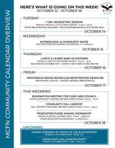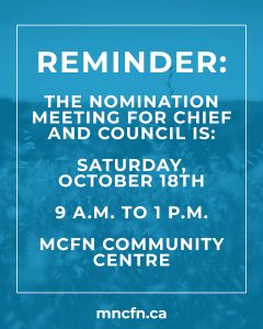 REMINDER: The Nomination Meeting for Chief and Council is happening THIS SATURDAY, October 18th, from 9 a.m. to 1 p.m. at the MCFN Community Centre. Due to the