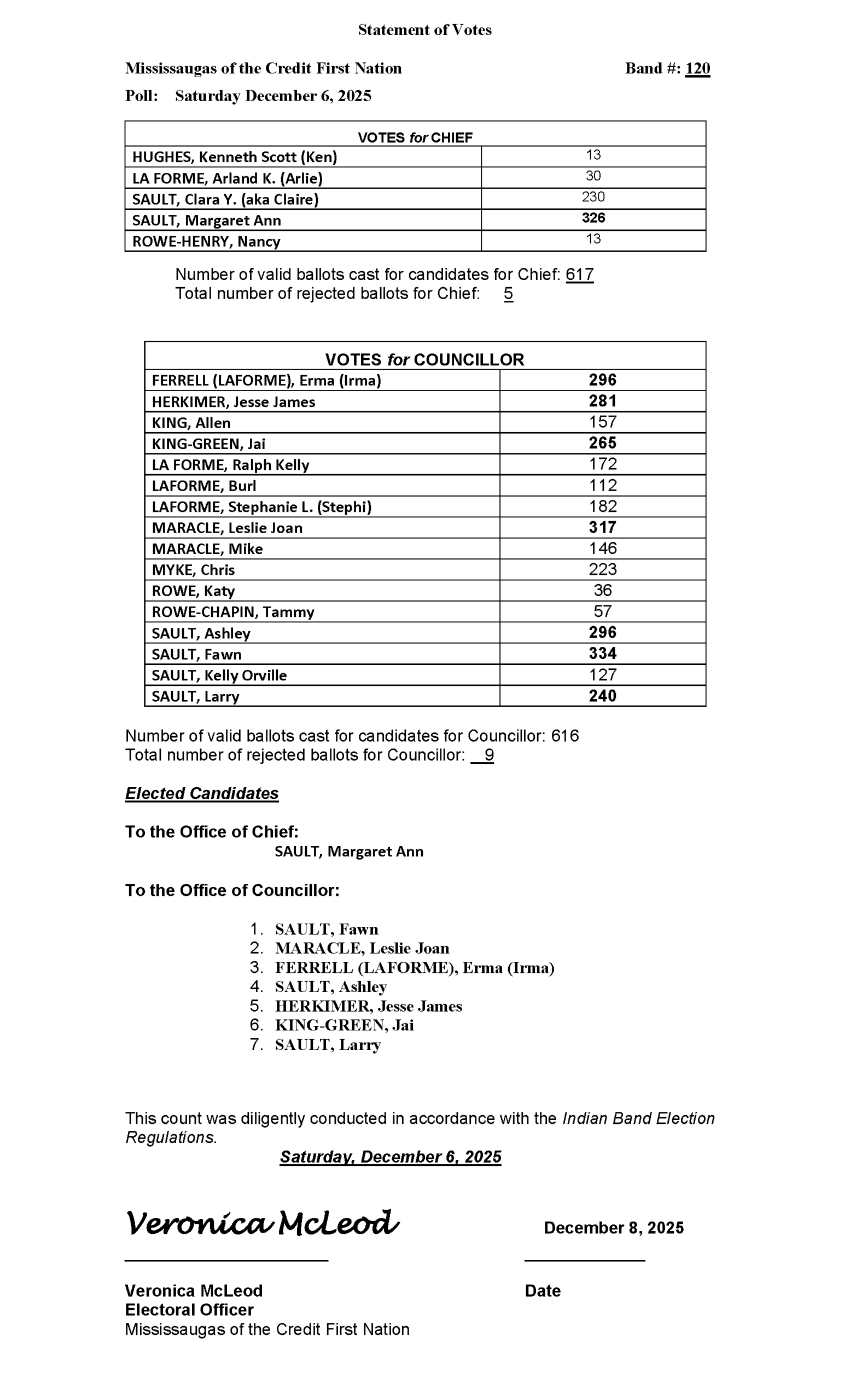 Mississaugas of the Credit First Nation (MCFN) is pleased to announce the official results of the 2025 General Election, held on Saturday, December 6, 2025.