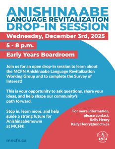 📅 Wednesday, December 3rd, 2025 🕔 5–8 p.m. 📍 Early Years Boardroom Help shape the future of Anishinaabemowin at MCFN! Drop in to ask